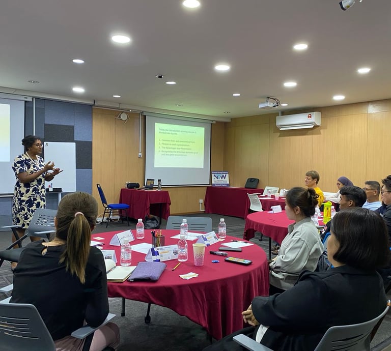 Participants were trained with tools to eliminate presentation anxiety and deliver structured, strong talks in English.
